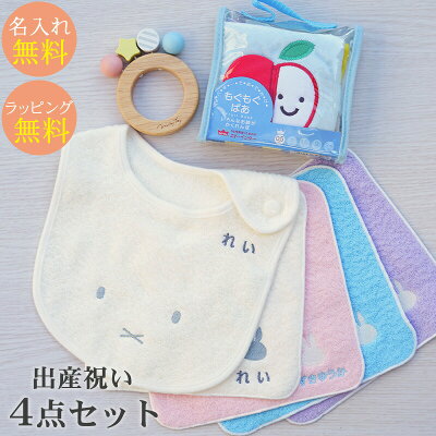 出産祝い ギフトセット 今治タオル 名入れミッフィースタイ&ハンカチ&木のラトル&布絵本もぐもぐばあ【エドインター ギフトボックス入り 男の子 女の子 名前入り 刺繍 国産 赤ちゃん プレゼント ミルキートイ ボンボンラトル 木のおもちゃ 新作商品】